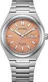 along with an integrated bracelet for effortless style. The textured orange dial features a bold black minute ring, luminous hands,